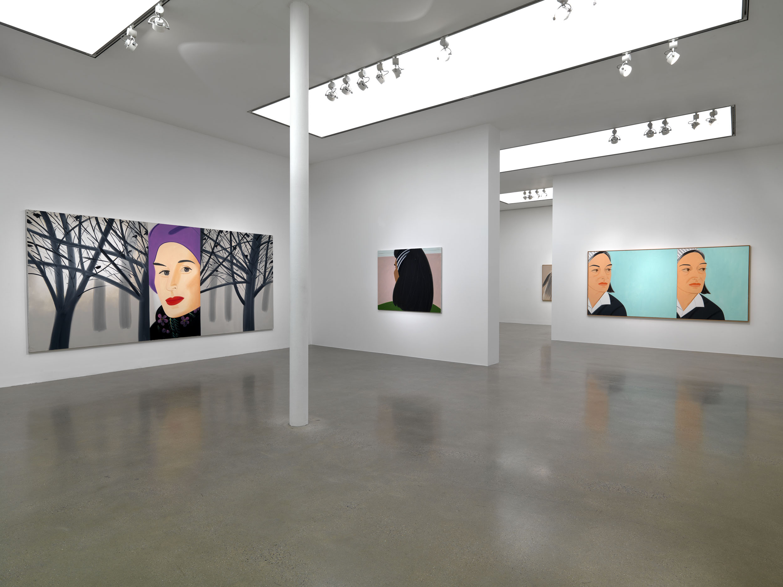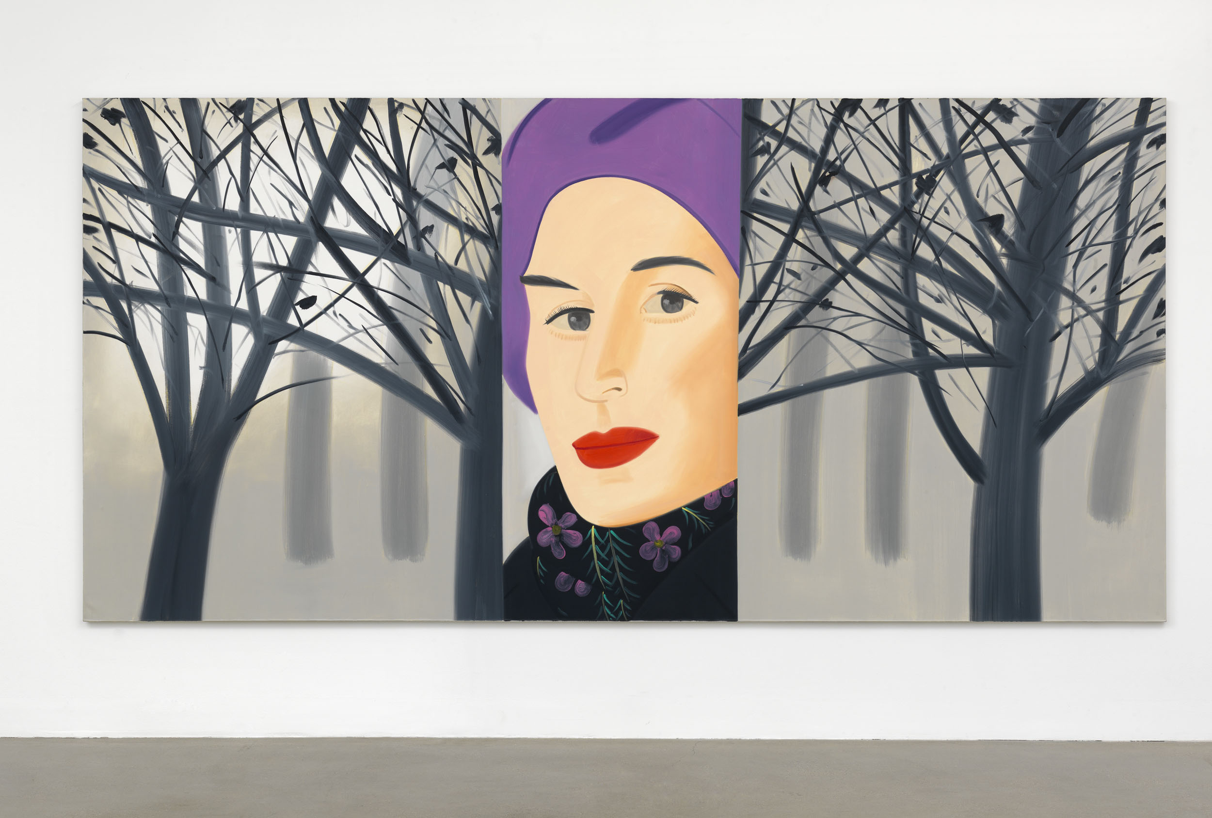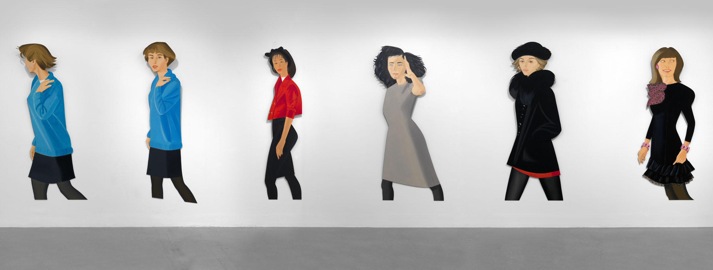 The panels hanging off the walls like a lavish and epurated fashion collage create a contrast between their nature as paintings and as cardboard-cutout like figures. And by walking alongside them while looking, we complement their immobile, meditative quality. All of this retains a taste for fashion and attitude that captures its time beautifully and clearly. As Katz puts so himself, when he was interviewed by Martin Clark, ” (…) I think style is the content of my painting, and style belongs to fashion. Fashion is in the immediate present, and that’s really what I am after in my work.”