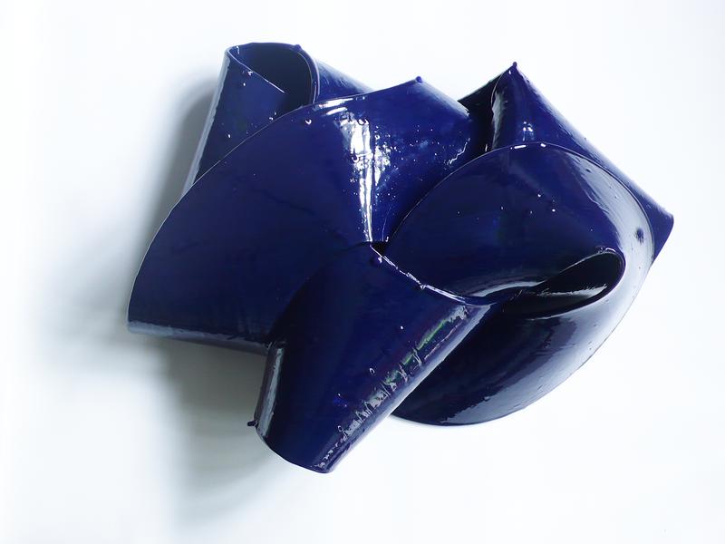 These deep, dark waters now reflected an inner melancholy or torment that the forces of nature could both show and channel. Is this romantic ideal dead? Not according to Galerie Chantal Crousel’s most recent group exhibition, Dark Waters. The theme of water is used to host a large array of interpretations in many different mediums and subjects. The arrival of water in the gallery space is welcomed by its sound as we walk in; David Douard’s sculpture MO: need sets the mood through its complex and elegant structure of plexiglas, cables, metal and flowing water, reminiscent of a urban, futuristic fountain. Its twisting forms seem to complement Jean-Luc Moulène’s Drapé Nuit, a twisting, serpentine work in rubber and epoxy resin, creating a shape “pulled inside out, creating a void…” according to the artist. It mirrors his work on paper Cristal Vague, that seems to create a strangely ordered chaos on the page.