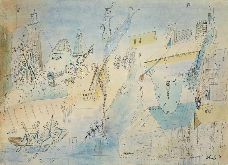 Most of these works I have mentioned, and those completing the exhibition as a whole, are more or less recent, from 2000 and onwards, with a few striking exceptions such as Broodthaers. These exceptions also include notably two works on paper from the end of the 19th century and early forties: the first is Marina, by Edouard Manet, a delicate and elegant etching on paper of ships at sea, a drawing reminiscent of his own maritime travels and sketches, when he was still aiming for a career in the Navy, before devoting his life entirely to his art. Its powerful dark lines contrast with the second work on paper, Untitled by WOLS (Alfred Otto Wolfgang Schulze). His watercolour depiction of a harbour seem lyrical and dreamlike, in soft tones of yellow and blue, yet its accumulation of details reflects the time he spent at de Camp des Milles concentration camp in 1939, fighting against confinement and anxiety. The presence of the two works on paper within a contemporary display give an additional sense of the historical context and aesthetic legacy surrounding seascapes, adding to the dialogues going on within the space from one work to another.