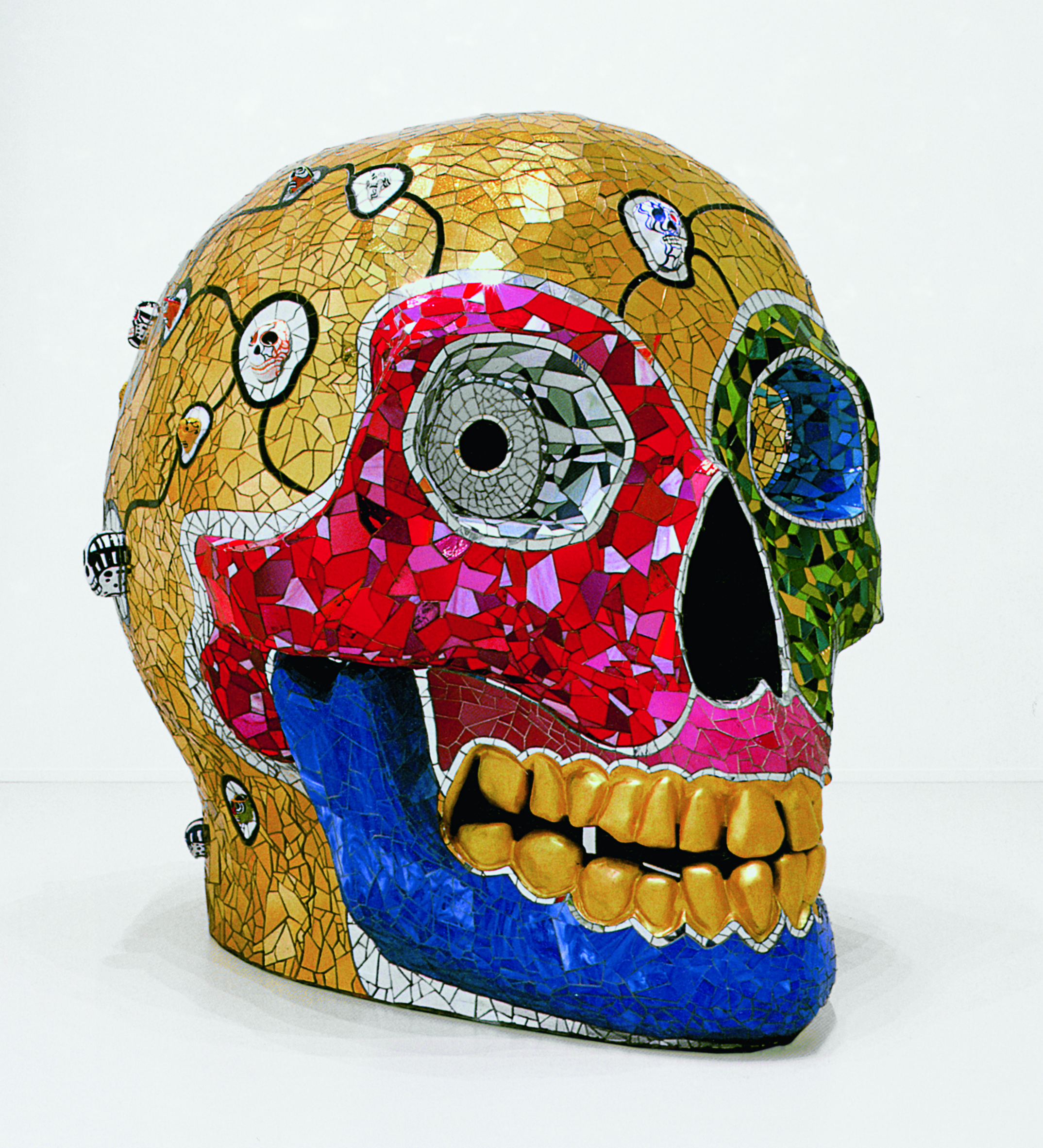 It creates a lasting sense of unity: the large skull, multicoloured and cheerful, inspired from the Mexican Dia de los Muertos, finally unites the careless sense of joy in many of her work with the ominous sense of the morbid that pervades others.